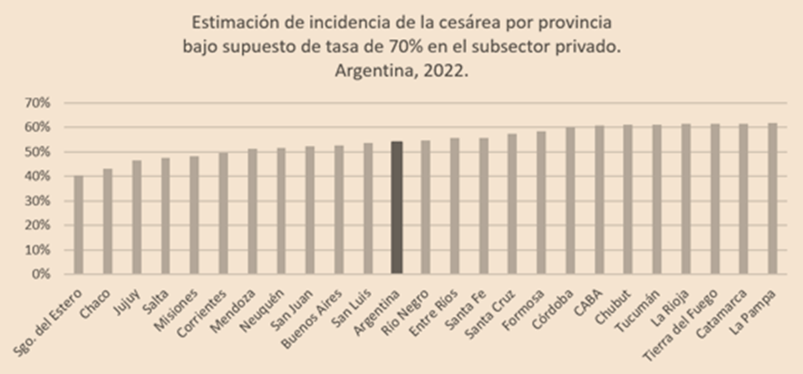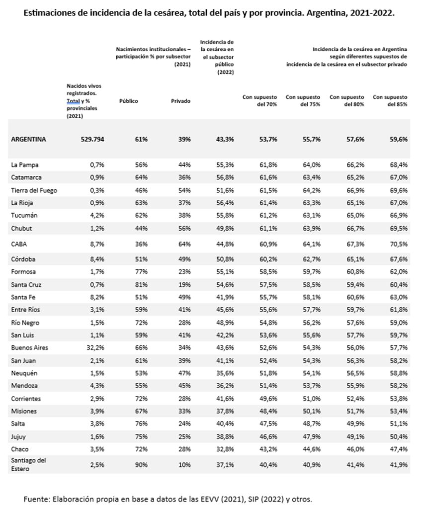 «Aunque por el momento no sea posible responder a este interrogante con un dato censal preciso, sí puede afirmarse que es altamente probable que hoy en Argentina ya más de la mitad de los nacimientos se concreten mediante cesárea. Según nuestras estimaciones, dependiendo de qué valores se imputen a la incidencia de la cesárea en el subsector privado, actualmente las cesáreas representarían una proporción de entre 54% y 60% del total de nacimientos del país.