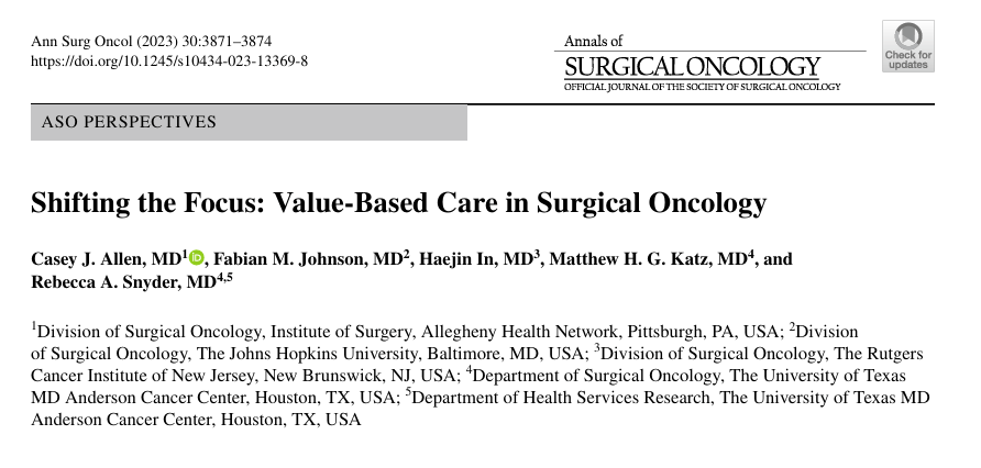 El sistema de salud de EE. UU. se está embarcando en una era de transformación de la atención basada en el valor que cambiará la forma en que educamos, innovamos y cuidamos a los pacientes. Al ser pioneros en el rediseño de la atención y el cambio cultural, los oncólogos quirúrgicos deben desempeñar un papel de liderazgo en la mejora del valor de la atención oncológica. Debemos trabajar de manera reflexiva e intencional hacia el objetivo colectivo de reducir costos, mejorar los resultados y priorizar el bienestar del paciente para garantizar que nuestros pacientes y sus familias reciban una atención valiosa y de alto valor.
