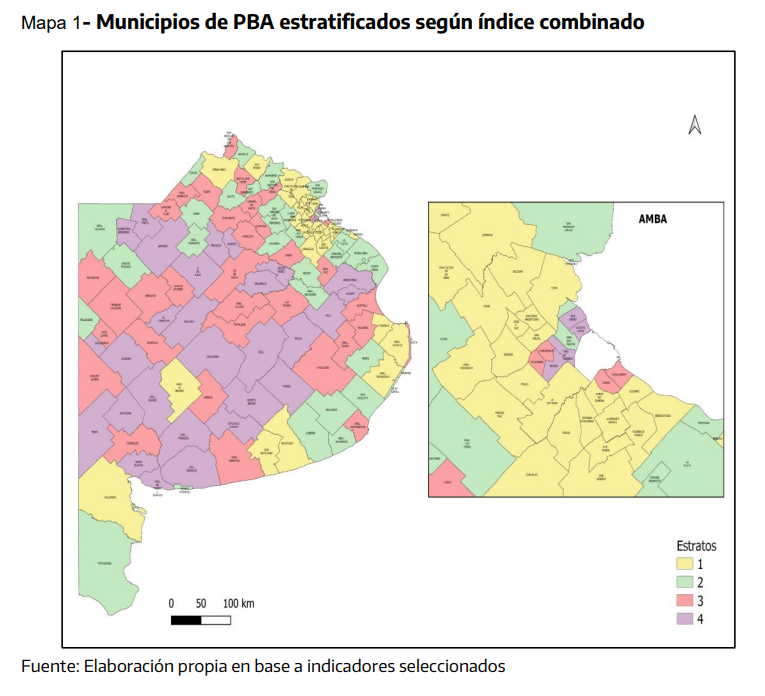 Se observa en esta estratificación, un mosaico de cuatro realidades diferentes, el área de mayor vulnerabilidad corresponde al conurbano y excepcionalmente a partidos del resto de la Provincia. Se trata de regiones de pobreza urbana. Un segundo estrato representado en su mayoría por partidos más alejados de la capital, pero con perfil más rural. Los sectores de mejor situación social, 3 y 4 corresponden casi con exclusividad a partidos internos de la Provincia, de producción agrícola-ganadera