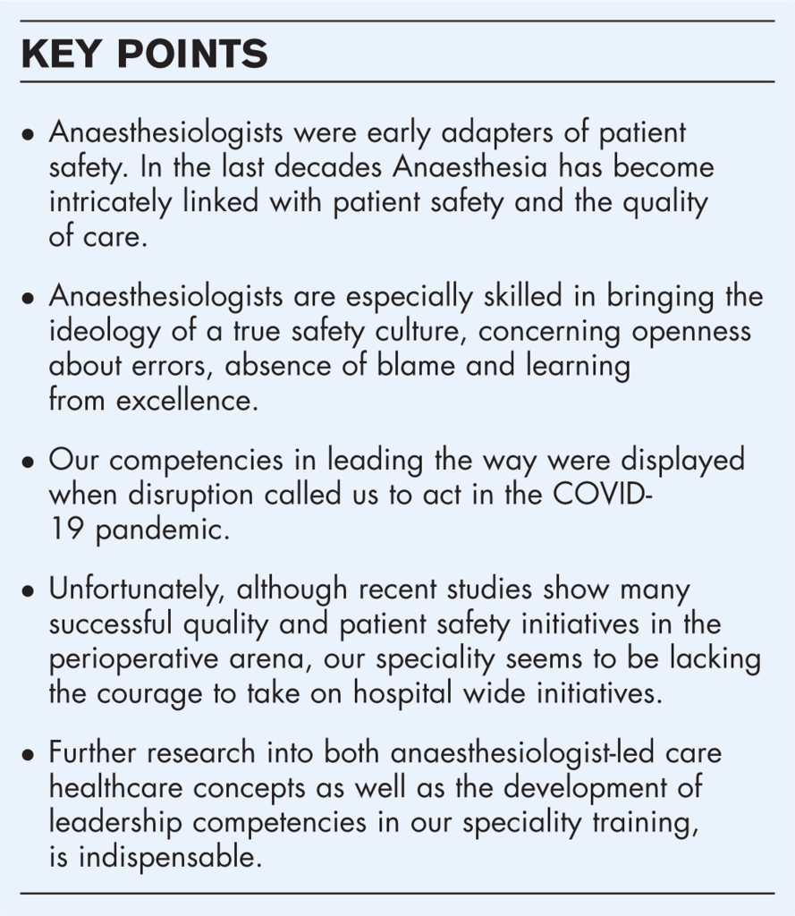 Hoy en día, se puede observar una transición de la atención peroperatoria a la perioperatoria con el anestesiólogo como parte de un equipo multidisciplinario. En consecuencia, varios departamentos cambiaron sus nombres, reflejando esta transición. La medicina perioperatoria crea nuevas oportunidades, ampliando nuestro ámbito profesional de una forma más holística. Desafortunadamente, lo que probablemente refleja la naturaleza central de la profesión, no a menudo asumimos un papel de liderazgo en el área de la calidad de la atención y la seguridad del paciente. Durante la pandemia de COVID-19, los anestesiólogos trabajaron en primera línea en muchos países, pero después volvimos a desaparecer del foco de atención.