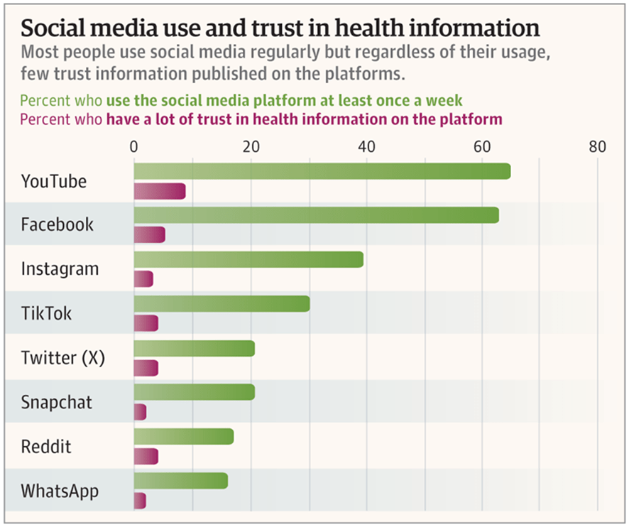 Muchas personas informaron un alto uso de las redes sociales, pero pocas confían en la información de salud publicada en dichas plataformas. YouTube y Facebook fueron los sitios más populares: el 65% y el 63% de los encuestados informaron que visitaban las plataformas cada semana, respectivamente. Pero la confianza en estos sitios era considerablemente baja. Solo el 8% de los encuestados dijo que tendría mucha confianza en la información de salud en YouTube, y el 5% confiaría en la información de salud en Facebook. Twitter, ahora conocido como X, era utilizado semanalmente por el 21% de los encuestados, aunque solo el 4% confiaría en la información de salud en el sitio. Las personas que usaban con frecuencia las redes sociales para buscar información sobre salud eran más propensas a creer en afirmaciones falsas sobre la salud.