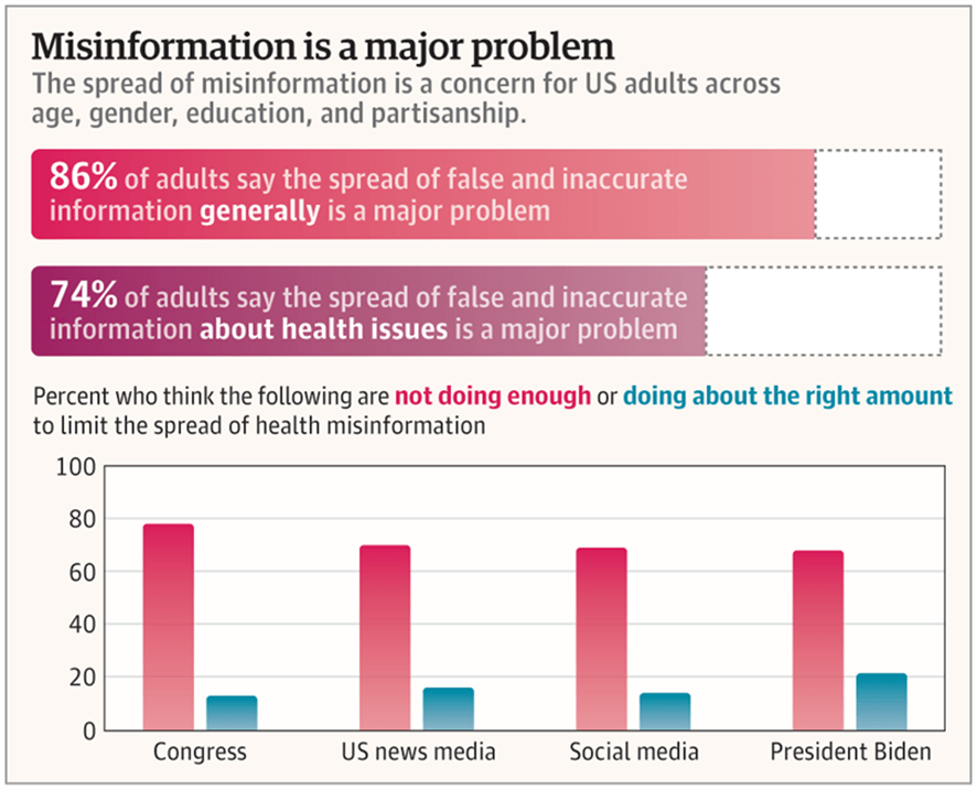 Otro hallazgo clave fue que muchas personas están preocupadas por la propagación de afirmaciones falsas sobre la salud y quieren que se haga más para limitarla. La mayoría de las personas informaron que la información inexacta sobre la salud es un problema importante. De hecho, el 86% de los encuestados dijo que la información falsa e inexacta en general es un problema importante, y el 74% informó que las afirmaciones falsas sobre la salud específicamente son un problema importante.