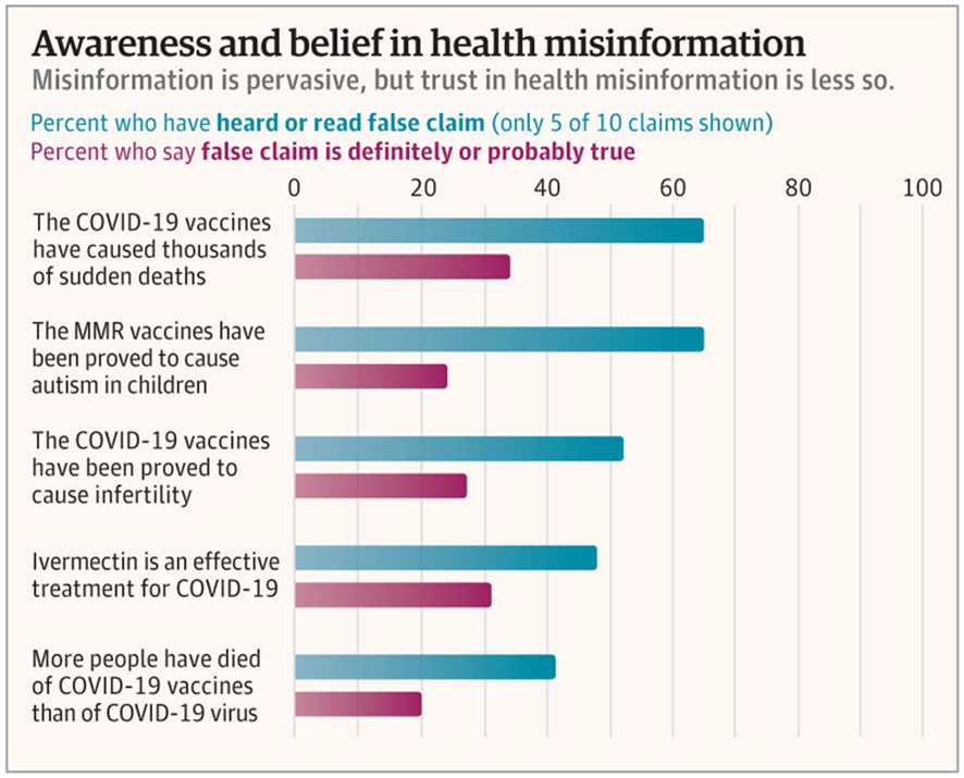 En general, el 96% de los participantes informaron que habían escuchado al menos 1 de las 10 afirmaciones inexactas sobre la salud enumeradas en la encuesta de KFF: que las vacunas contra el sarampión, las paperas y la rubéola (MME) causan autismo, por ejemplo, o que la ivermectina es eficaz contra el COVID-19. Y aunque la exposición a la desinformación sobre la salud fue desenfrenada, el porcentaje de personas que han escuchado afirmaciones falsas y creen que son probable o definitivamente verdaderas osciló entre el 14% y el 35%. «Una conclusión clave que obtuvimos de los datos es que la gente está escuchando información errónea, pero no muchos están convencidos de que sea cierta», dijo Lopes.