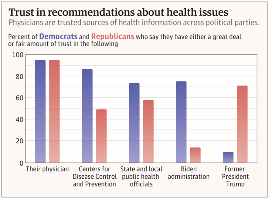 La encuesta mostró que la confianza en los profesionales de la salud cruzó las líneas partidistas: el 95% de los demócratas y republicanos informaron que confiaban en sus médicos personales para que les proporcionaran las recomendaciones correctas sobre temas de salud. «Los médicos están particularmente bien posicionados para ser los mensajeros cuando se trata de recomendaciones de salud en las que la gente realmente confía», dijo Lunna Lopes, MSc, autora principal del informe y analista senior de encuestas en KFF, a JAMA Medical News en una entrevista.
