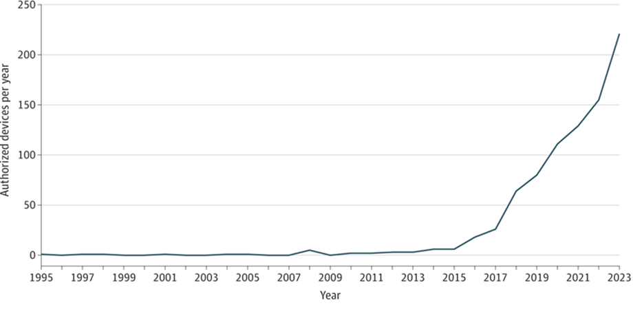 La primera aprobación de un dispositivo médico parcialmente habilitado con IA por parte de la FDA tuvo lugar en 1995, cuando la FDA aprobó PAPNET, un software que utilizaba redes neuronales para prevenir el diagnóstico erróneo de cáncer de cuello uterino en mujeres que se sometían a pruebas de Papanicolaou. Aunque se demostró que PAPNET era más preciso que los patólogos humanos, no se adoptó en la práctica clínica debido a su inadecuada relación costo-beneficio. 5 Desde entonces, la FDA ha autorizado aproximadamente 1000 dispositivos médicos habilitados con IA, siendo su uso más común en radiología, seguido de cardiología ( Figura 1 ). 6