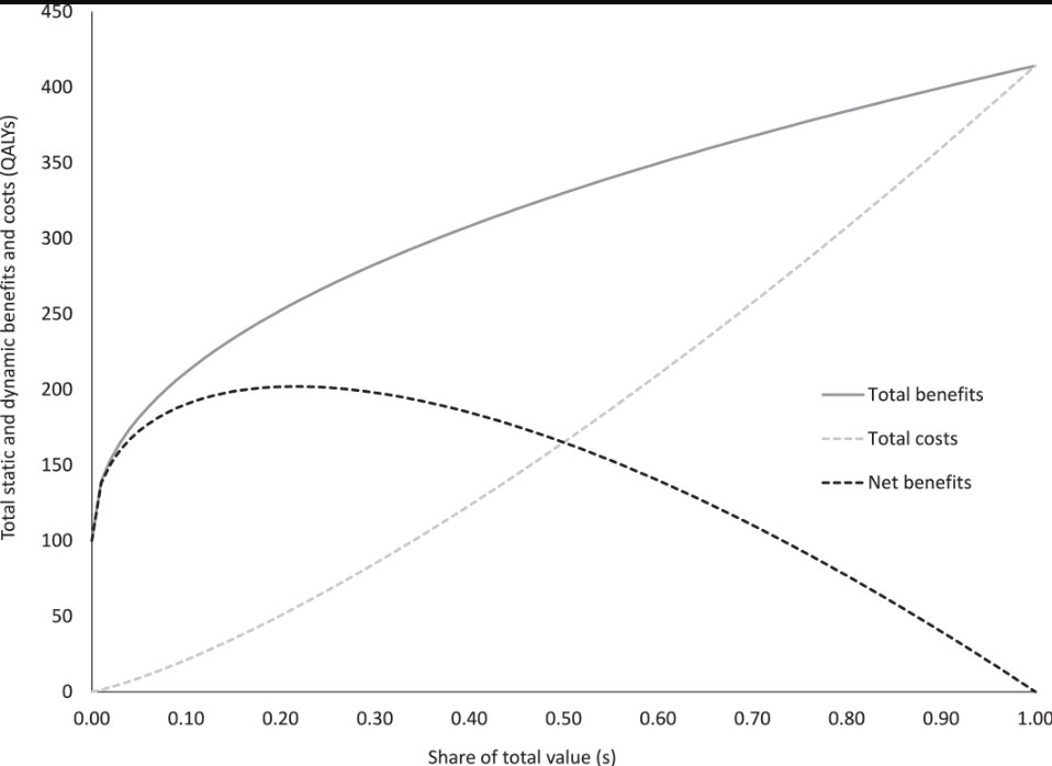 Centrándonos inicialmente en un objetivo de salud pública, una proporción óptima maximizará los beneficios totales (estáticos y dinámicos) para la salud ( T = T b + T d ) menos los costos totales para la salud ( s . T ). La proporción óptima ( s * ) tomará algún valor entre 0 y menos de 1, porque si la proporción es igual a uno, entonces no solo se pierde el beneficio estático completo sino también los beneficios dinámicos completos.Por lo tanto, es fundamental establecer el vínculo entre la proporción de beneficios perdidos por el sistema de atención sanitaria