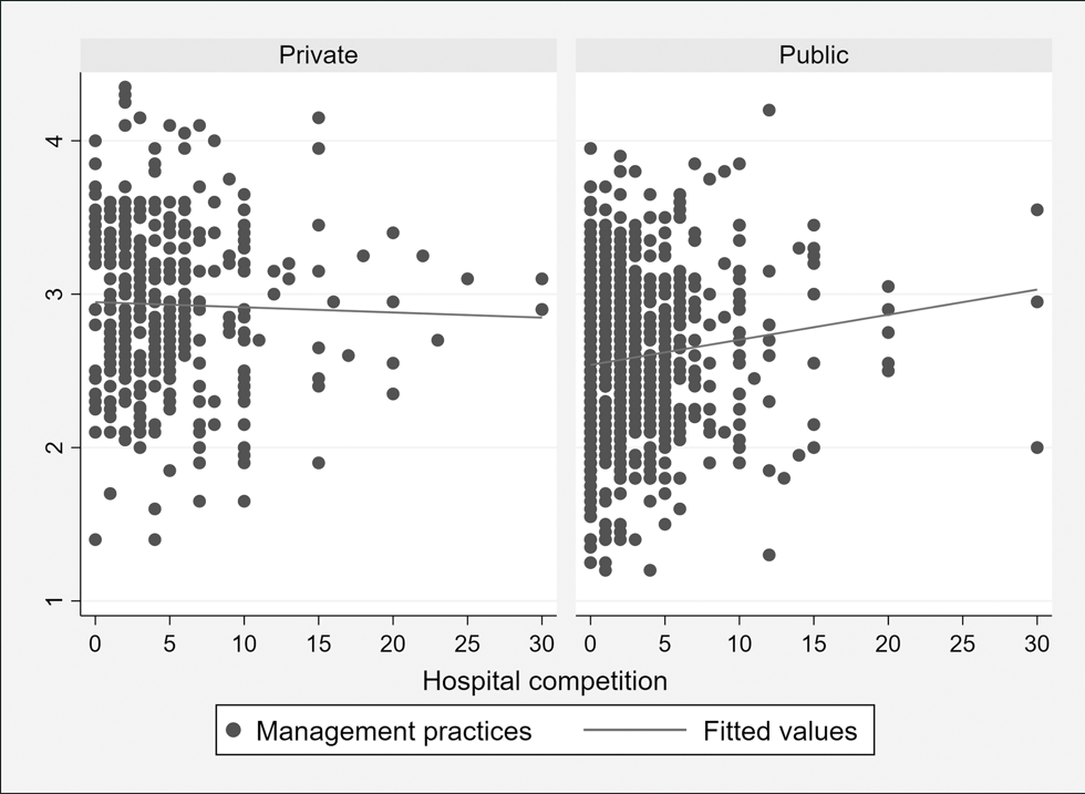 El efecto de tener más competidores también podría diferir entre hospitales públicos y privados, por ejemplo, el efecto disciplinario de la competencia en los estándares de gestión puede depender de la sustituibilidad de los servicios prestados por los hospitales, de su proximidad, tamaño y otros factores. Si bien muchos de estos factores han sido analizados en la literatura, aquí centramos la atención en la hipótesis de que las mejores prácticas de gestión están asociadas con una mayor competencia en el mercado local, desenredando el efecto entre hospitales públicos y privados. Utilizamos la información reportada en los datos de WMS sobre el grado de competencia que enfrentan los hospitales en el mercado local, según lo informado por el encuestado. El número promedio de competidores (hospitalarios) en el sector público es 3,1, mientras que en el sector privado es 6,5. En la Figura 4 , ilustramos la relación (incondicional) entre la puntuación de las prácticas de gestión y la competencia hospitalaria en hospitales públicos y privados. En los hospitales de propiedad privada no encontramos una correlación estadísticamente significativa, mientras que la evidencia para los hospitales públicos muestra que la competencia reducida está asociada con peores prácticas de gestión. Una regresión simple entre las puntuaciones de gestión y el número de competidores, controlando los atributos del hospital y los efectos fijos del país, devuelve un coeficiente de 0,003 (p-valor = 0,003) y 0,011 (p-valor = 0,004) –con una elasticidad de 0,006 y 0,013– para hospitales privados y públicos, respectivamente. Para tener una idea de la magnitud del efecto de la competencia, las estimaciones anteriores indican que un aumento de 5 (hospitales) competidores –comparable a un cambio del primer al tercer cuartil de la distribución de los competidores– está asociado con un aumento en la puntuación de gestión de los hospitales privados (públicos) igual al 5% (15%) de una desviación estándar. Sin embargo, observe que, dado que una mejor gestión puede reducir la probabilidad de que otros hospitales entren al mercado, la causalidad inversa puede inducir una selección negativa y dar como resultado una subestimación del efecto (positivo) de la competencia. Bloom et al. [ 2 ] explotan un experimento natural en el cierre de hospitales y encuentran un impacto mayor.
