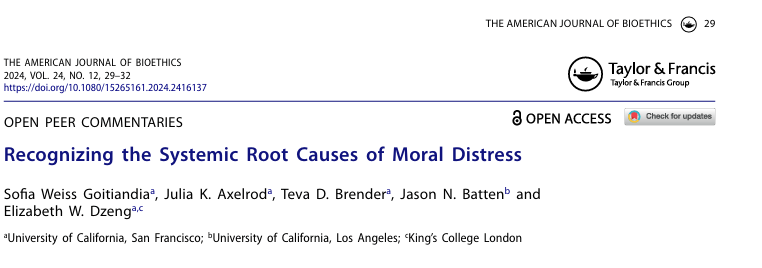 En la distinción de Buchbinder et al. entre sufrimiento moral y estrés moral, el sufrimiento moral puede explicarse principalmente con referencia a individuos o conflictos específicos e identificables. Por el contrario, el estrés moral no puede explicarse con tanta precisión: a diferencia de la angustia moral, en la que puede ser fácil culpar a determinados responsables de la toma de decisiones o a agentes de autoridad (Dudzinski 2016), el estrés moral puede no dar lugar a objetivos fáciles de culpa, aparte de culpar al «sistema» mismo… Esto se debe a que las fuentes [de estrés moral] a menudo se encuentran fuera de los encuentros clínicos individuales y las decisiones centradas en el paciente. En cambio, [el] enfoque [del estrés moral] está en los aspectos estructurales cotidianos de la atención médica que producen estrés. (Buchbinder et al. 2024, 12)
