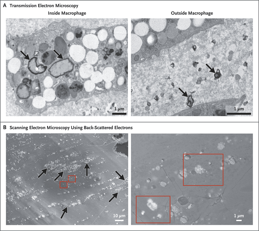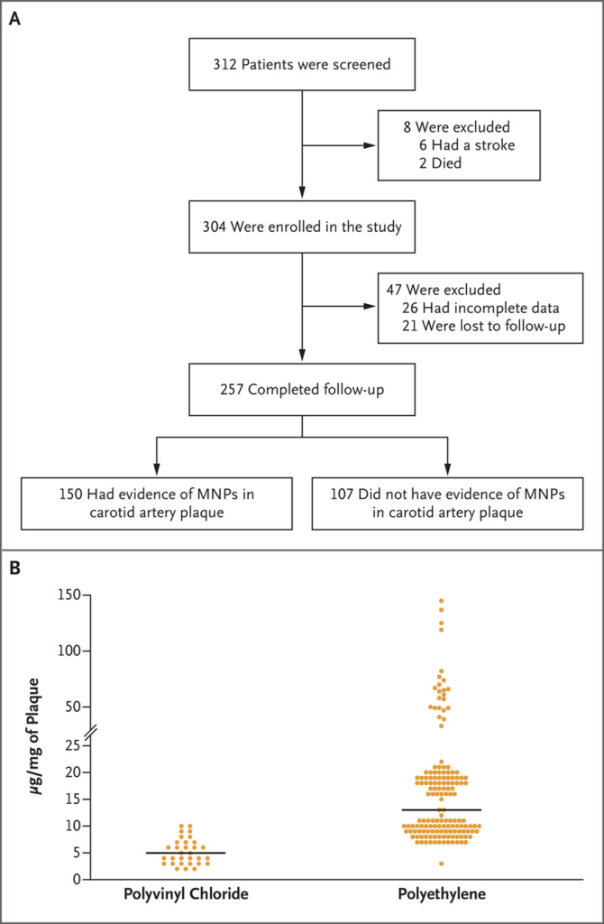 Se incluyeron en el estudio un total de 304 pacientes, y 257 completaron un seguimiento medio (±DE) de 33,7 ± 6,9 meses. Se detectó polietileno en la placa de la arteria carótida de 150 pacientes (58,4 %), con un nivel medio de 21,7 ± 24,5 μg por miligramo de placa; 31 pacientes (12,1 %) también tenían cantidades mensurables de cloruro de polivinilo, con un nivel medio de 5,2 ± 2,4 μg por miligramo de placa. La microscopía electrónica reveló partículas extrañas visibles de bordes irregulares entre los macrófagos de la placa y dispersas en los restos externos. El examen radiográfico mostró que algunas de estas partículas incluían cloro. Los pacientes en los que se detectaron MNP dentro del ateroma tuvieron un riesgo mayor de sufrir un evento final primario que aquellos en los que no se detectaron estas sustancias (cociente de riesgos, 4,53; intervalo de confianza del 95 %, 2,00 a 10,27; P < 0,001).