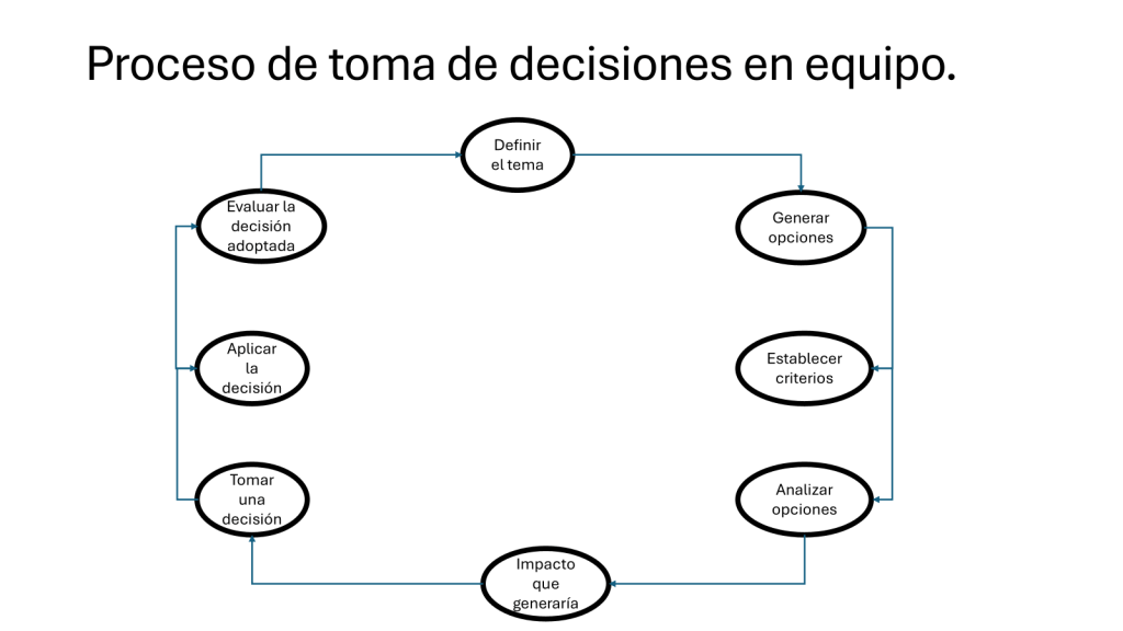 - El equipo, sus jefes e integrantes deben tomar decisiones, compartirlas, comunicarlas, explicarlas, fundarlas. Saber tomar decisiones, quien lo tiene que hacer y en que momento. Como se comunican las mismas en el equipo, y hacia sus pacientes y familias. Tomar decisiones implica lo que se llaman ciclos recursivos, donde cada paso del ciclo es productor del próximo paso. Esto implica: definir el tema, generar opciones, establecer criterios, analizar las opciones, consultar en relación al impacto sistémico de estas decisiones, entonces tomar una decisión, aplicar la decisión, evaluar la decisión adoptada. El proceso engloba como se observa ocho elementos, cinco de ellos deben ser previos a tomar una decisión, especial es el de evaluación del impacto que generó en el resto. El sexto es tomar la decisión, llevar a la práctica lo acordado, y evaluar los resultados de la decisión adoptada. Definir el tema sobre lo que se tomará una decisión. Muchas veces se conversa en equipo sin tener una definición clara sobre el tema real que se está discutiendo. Que está detrás de esa decisión. Cuidado con la infiltración en estas decisiones del complejo industrial médico y su capacidad de influencia sobre los médicos, en ocasiones con un claro conflicto de intereses. Es frecuente que los equipos y sus lideres rehúsen discutir temas de gestión de procesos, si de pacientes complejos y difíciles, de decisiones terapéuticas comprometidas, pero no como dar las altas temprano o dejar de utilizar medicamentos o prácticas innecesarias.