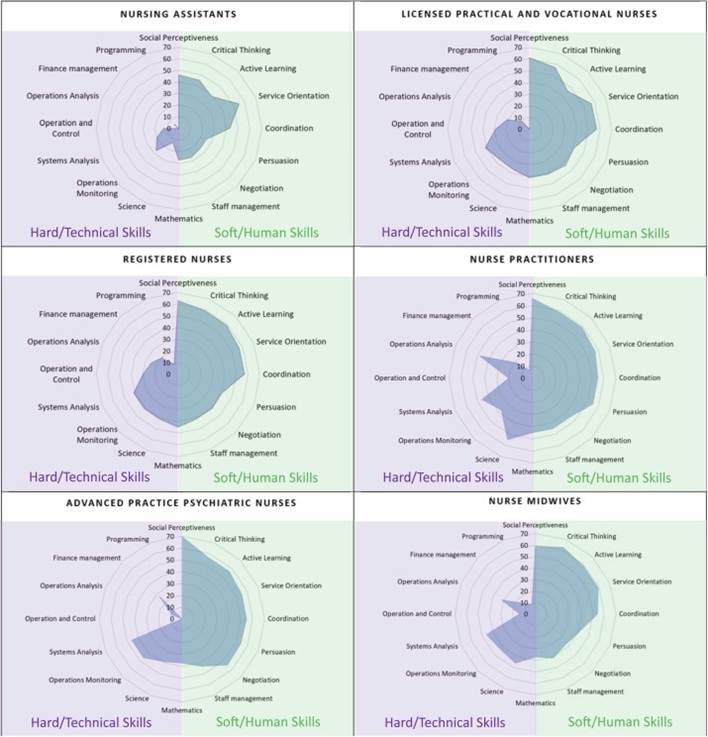 Figura 1. Mapas de habilidades ocupacionales duras y blandas, por ocupación de enfermería. Las figuras asignan cada ocupación a las habilidades blandas y duras necesarias para esa ocupación. La necesidad de cada habilidad está representada por la distancia desde el centro (0, ninguna necesidad) hasta el círculo más externo (70, alta necesidad). Los autores clasificaron las habilidades en habilidades duras (el área violeta) y habilidades blandas (el área verde). Cuanto mayor sea el área del mapa de habilidades de una ocupación que se encuentra en el área de habilidades blandas, menor es el riesgo de que la IA reemplace a los humanos en la ocupación. Los datos de habilidades para las ocupaciones se obtuvieron de O*NET OnLine (https://www.onetonline.org/). Consulte el suplemento digital para obtener más detalles.