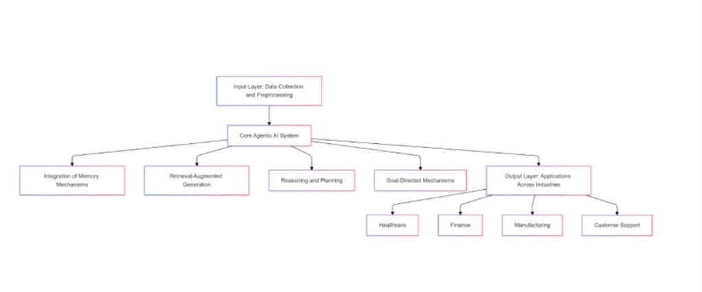 Para ilustrar mejor el proceso de integración de la IA Agentic en la sociedad, la Figura 2 describe las etapas clave. Esto incluye la recopilación y el preprocesamiento de datos, la funcionalidad principal del sistema de IA Agentic y su implementación en diversos sectores, como la salud, las finanzas, la manufactura y la atención al cliente. El diagrama de flujo representa visualmente la adaptabilidad e independencia de la IA Agentic en entornos dinámicos.