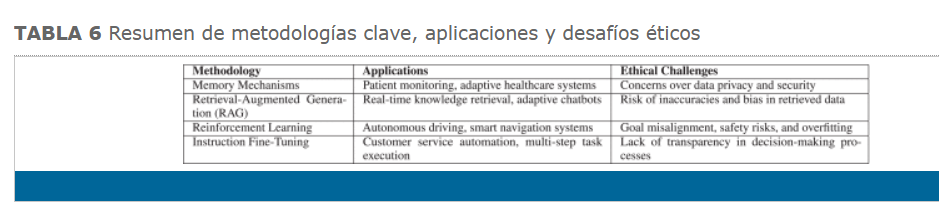 La Tabla 10 presenta un resumen de los principales desafíos y limitaciones técnicas que se enfrentan en el desarrollo e implementación de la IA Agentic. Abordar estos desafíos es esencial para el avance del campo y garantizar que los sistemas de IA Agentic funcionen de forma eficaz y responsable en situaciones reales.