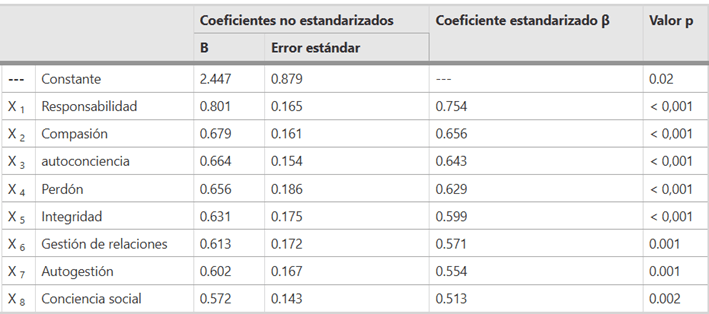 Los resultados del análisis de regresión lineal múltiple para determinar el efecto simultáneo de diferentes dimensiones de la inteligencia moral y emocional en el compromiso organizacional de las enfermeras mostraron que las variables significativas en el modelo determinadas mediante el método Enter fueron, en orden de importancia: “responsabilidad, compasión, autoconciencia, perdón, integridad, gestión de relaciones, autogestión y conciencia social”. Los coeficientes β para las variables influyentes, que indican su prioridad de impacto en el compromiso organizacional, se presentan en la Tabla 3. El análisis también mostró que el R 2 ajustado del modelo procesado fue de 0,72, lo que significa que el 72 % de los cambios en la puntuación de compromiso organizacional de las enfermeras podrían explicarse por las variables del modelo. La ecuación lineal que explica la puntuación de compromiso organizacional de las enfermeras con base en las variables del modelo se obtuvo de la siguiente manera:
