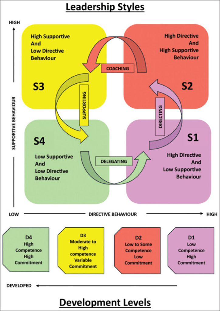 Una matriz basada en el modelo de liderazgo situacional desarrollado por Paul Hersey y Kenneth Blanchard describe diferentes estilos de liderazgo que deben adaptarse según el nivel de desarrollo de los seguidores o miembros del equipo. Los cuatro estilos de liderazgo —dirección (S1), coaching (S2), apoyo (S3) y delegación (S4)— se corresponden con los niveles de desarrollo de los miembros del equipo (D1-D4) [ Figura 1 ].