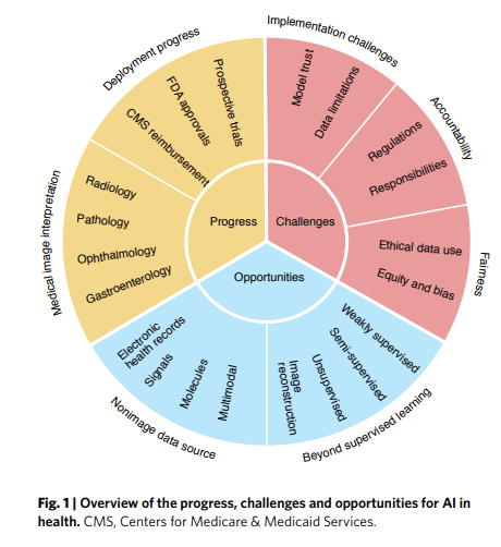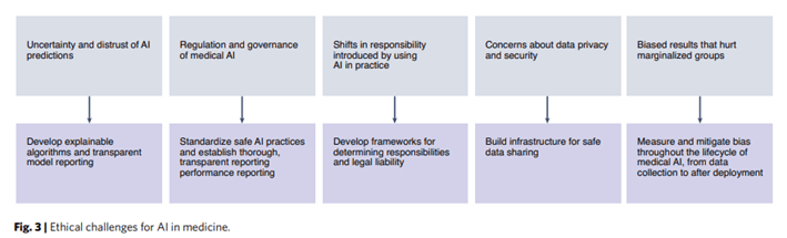 A pesar de los sorprendentes avances, el campo de la IA médica se enfrenta a importantes desafíos técnicos, especialmente en términos de generar confianza en los usuarios en los sistemas de IA y componer conjuntos de datos de entrenamiento. También quedan preguntas sobre la regulación de la IA en la medicina y las formas en que la IA puede cambiar y crear responsabilidades en todo el sistema sanitario, afectando tanto a los investigadores como a los médicos y a los pacientes. Por último, existen importantes preocupaciones éticas sobre el uso de los datos y la equidad en la IA médica (Fig. 3).
