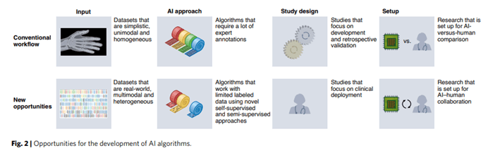 Los estudios médicos de IA a menudo siguen un patrón familiar, abordando un problema de clasificación de imágenes, utilizando el aprendizaje supervisado en datos etiquetados para entrenar un sistema de IA y luego evaluando el sistema comparándolo con expertos humanos. A pesar de que estos estudios han logrado avances notables, presentamos otras tres prometedoras vías de investigación que rompen con este molde (Fig. 2). En primer lugar, abordamos las fuentes de datos que no son imágenes, como las secuencias de texto, químicas y genómicas, que pueden proporcionar información médica valiosa. En segundo lugar, discutimos las formulaciones de problemas que van más allá del aprendizaje supervisado, obteniendo información a partir de datos no etiquetados o imperfectos a través de paradigmas como el aprendizaje no supervisado o semisupervisado. Por último, nos fijamos en los sistemas de IA que colaboran con los humanos en lugar de competir contra ellos, lo que supone un camino para lograr un mejor rendimiento que la IA o los humanos solos.