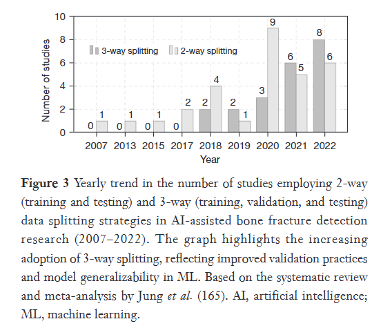 Figura 3. Tendencia anual en el número de estudios que emplean estrategias de división de datos bidireccionales (entrenamiento y prueba) y tridireccionales (entrenamiento, validación y prueba) en la investigación de detección de fracturas óseas asistida por IA (2007-2022). El gráfico destaca la creciente adopción de la división tridireccional, lo que refleja mejoras en las prácticas de validación y la generalización de modelos en el aprendizaje automático (ML). Basado en la revisión sistemática y el metanálisis de Jung et al. ( 165 ). IA: inteligencia artificial; ML: aprendizaje automático.