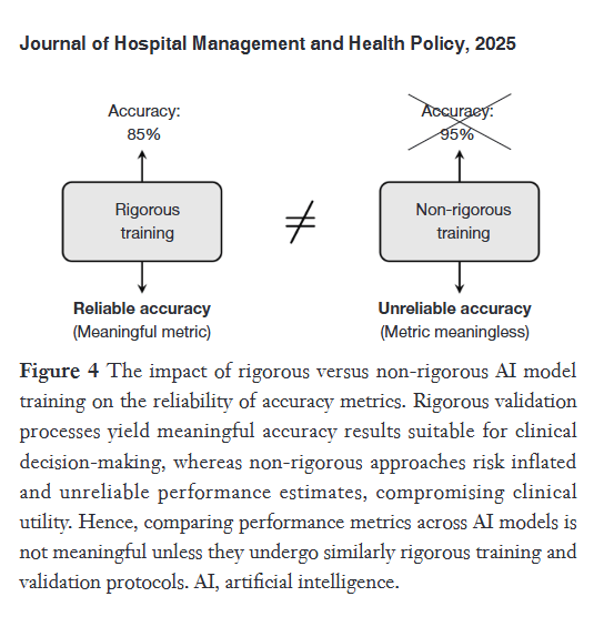 Figura 4. Impacto del entrenamiento riguroso y no riguroso de modelos de IA en la fiabilidad de las métricas de precisión. Los procesos de validación rigurosos producen resultados de precisión significativos, adecuados para la toma de decisiones clínicas, mientras que los enfoques no rigurosos conllevan el riesgo de estimaciones de rendimiento infladas y poco fiables, lo que compromete la utilidad clínica. Por lo tanto, comparar las métricas de rendimiento entre modelos de IA no es significativo a menos que se sometan a protocolos de entrenamiento y validación igualmente rigurosos. IA, inteligencia artificial.
