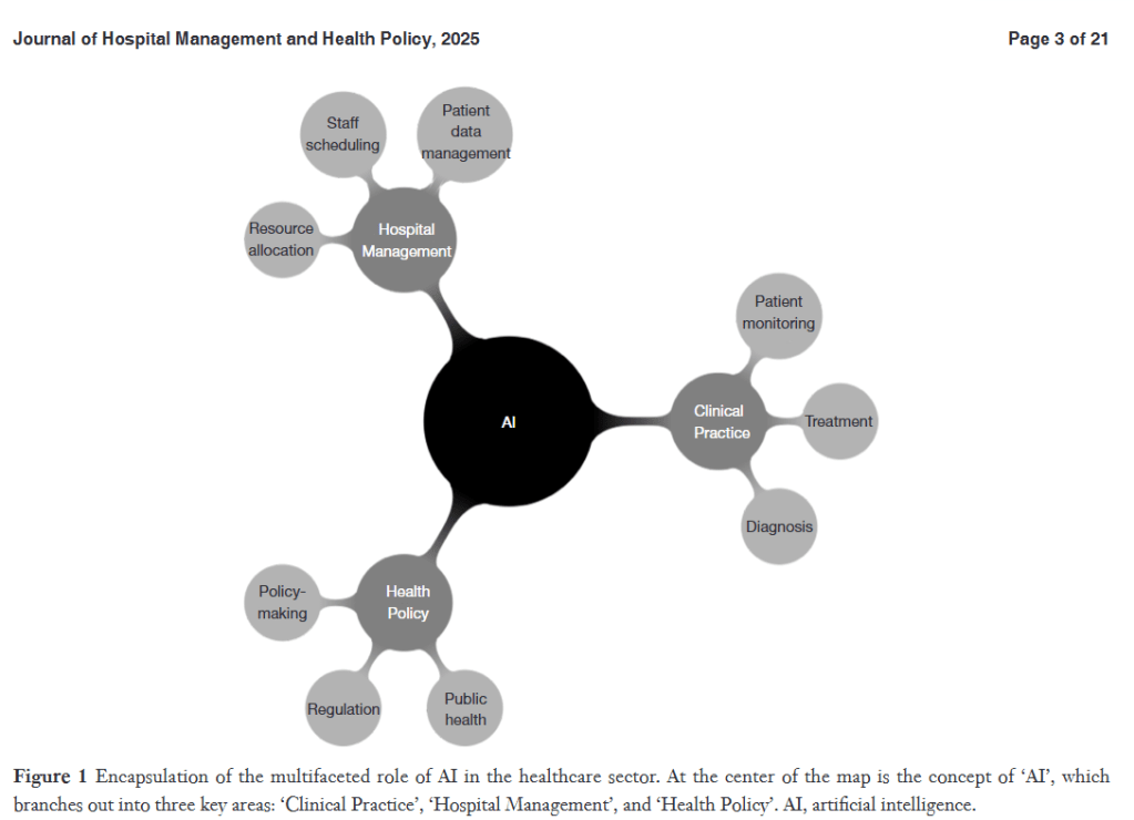 Figura 1. Resumen del rol multifacético de la IA en el sector sanitario. En el centro del mapa se encuentra el concepto de «IA», que se divide en tres áreas clave: «Práctica Clínica», «Gestión Hospitalaria» y «Política Sanitaria». IA, inteligencia artificial.