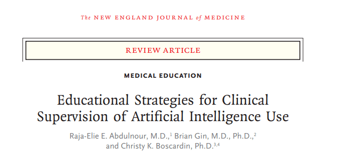Este artículo, publicado en la edición del 20 de agosto de 2025 del New England Journal of Medicine (VOL. 393, NÚM. 8), explora las estrategias educativas dirigidas a la supervisión clínica durante la integración y utilización de la inteligencia artificial en el campo médico. Las personas autoras —Dr. Raja-Elie E. Abdulnour, Brian Gin, MD, Ph.D., y Christy K. Boscardin, Ph.D.— presentan un análisis detallado sobre la importancia de formar a profesionales de la salud en el uso responsable y ético de herramientas basadas en inteligencia artificial.