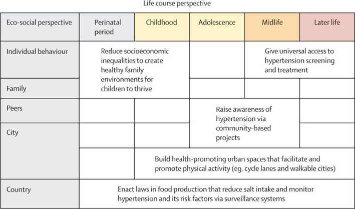 Figura 4 Ejemplos de prevención de la hipertensión en las dimensiones ecosociales y del curso de vida83
