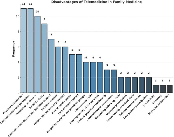 La Figura 3 muestra las desventajas de la telemedicina en medicina familiar y la frecuencia de su repetición en los estudios. En general, se identificaron 22 desventajas de la telemedicina en medicina familiar. La falta de examen físico y las barreras de comunicación/percepción se destacaron en el 30% de los estudios, mientras que las preocupaciones por la privacidad del paciente se citaron en el 24% y el acceso inadecuado a la tecnología de la comunicación se mencionó en el 20% de los estudios. Un desafío importante de la telemedicina en los servicios de medicina familiar es su incapacidad para realizar exámenes físicos [ 9 , 19 , 20 , 32 , 35 , 45 , 47 , 50 , 51 , 54 , 55 ]. La telemedicina resulta poco práctica para las consultas iniciales, las condiciones médicas complejas o las emergencias [ 5 ]. Además, algunos diagnósticos y decisiones clínicas no se pueden tomar sin realizar un examen físico [ 51 ]. Por ejemplo, diagnosticar las causas de mareos o erupciones cutáneas es difícil a través de síntomas autoinformados durante una llamada telefónica [ 51 ], al igual que condiciones críticas como dolor en el pecho o abdominal, problemas respiratorios, dolores de cabeza y trastornos musculoesqueléticos o neurológicos [ 20 ]. Sin una evaluación integral del paciente [ 2 , 42 , 47 ], la telemedicina conlleva el riesgo de diagnósticos inexactos [ 2 , 32 , 42 , 46 , 56 ], lo que puede conducir a prescripciones incorrectas, pruebas inapropiadas o tratamientos que son inadecuados o excesivos [ 32 , 58 ]. Además, un estudio sugiere que las consultas de telemedicina están asociadas con tasas más altas de prescripciones de antibióticos en comparación con las visitas en persona [ 58 ].