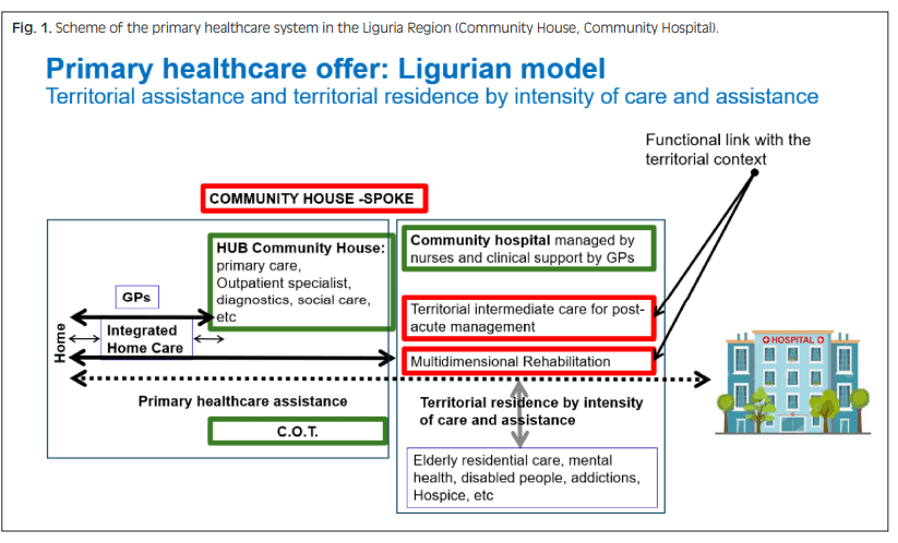 Esquema del sistema de atención primaria de salud en la Región de Liguria (Casa Comunitaria, Hospital Comunitario).