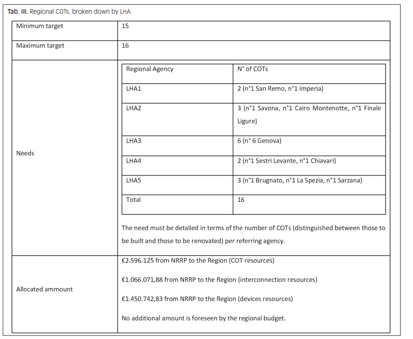Español El DM77 sugiere específicamente la creación de un Centro de Operaciones ( es decir, 116 117), una estructura regional que facilita el acceso de la población a la atención médica no urgente. Proporciona a los pacientes asistencia telefónica, los dirige a las estructuras de asistencia local transfiriendo sus llamadas al COT y transmite solicitudes urgentes de asistencia médica al número de emergencia (118). El DM 77/2022 designa el número único 116 117 como uno de los canales que progresivamente se convertirá en un medio ordinario de acceso al NHS. Cumple varios propósitos, incluyendo obtener información, recibir orientación inicial sobre los servicios, garantizar la continuidad de la atención y acceder a los servicios sociosanitarios. La Resolución del Gobierno Regional 715/2023 ha aprobado el «Proyecto para la activación gradual del Número Europeo Armonizado (NEA) para fines sociales 116 117 en la Región de Liguria». La Tabla III informa los objetivos regionales para los COT, desglosados por LHA.