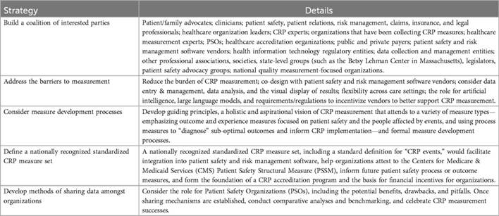 Si bien el desarrollo y la implementación de medidas de los programas de comunicación y resolución requerirán un esfuerzo interdisciplinario, hacerlo es una parte fundamental para mejorar la seguridad del paciente, la calidad de la atención y la experiencia de todos los afectados cuando los pacientes se ven perjudicados por la atención médica. Los resultados de los pacientes, las familias y los médicos deben ser el foco de la medición de la PCR, pero los aspectos y dimensiones adicionales de las PCR requerirán evaluación. A pesar de la clara justificación y los numerosos beneficios de las medidas de PCR, es posible que las organizaciones de atención médica no recopilen, analicen o compartan fácilmente sus datos. Un enfoque estratégico para desarrollar medidas de PCR es esencial para ir más allá del statu quo de la medición mínima de PCR. Es probable que sea necesario el compromiso continuo de los líderes organizacionales para demostrar cómo los CRP son componentes esenciales de su misión clínica y el entorno de trabajo para sus médicos, junto con incentivos regulatorios, de acreditación y / o financieros.