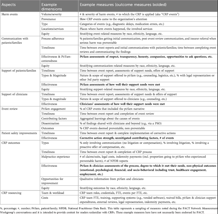 Si bien hay algunas organizaciones con CRP que utilizan algunas medidas, muchas organizaciones con CRP no las miden de forma rutinaria, y no conocemos ninguna organización con sistemas integrales de medición de CRP. Existen numerosos aspectos y dimensiones de los PCR que podrían medirse (ejemplos que se muestran en Cuadro 1). La ambición de medir exhaustivamente los CRP se ha visto obstaculizada por los desafíos de recopilar y analizar datos. Las organizaciones que han logrado mantener algunas mediciones de CRP citan una serie de beneficios, incluidos los datos que dan forma a los procesos y la implementación de CRP; un mejor diálogo sobre la seguridad del paciente y la mejora de la calidad; mayor participación de los médicos a través de conversaciones constructivas sobre eventos dañinos históricamente ocultos por una cultura de silencio y vergüenza; y una mayor responsabilidad interna por los CRP y la seguridad.