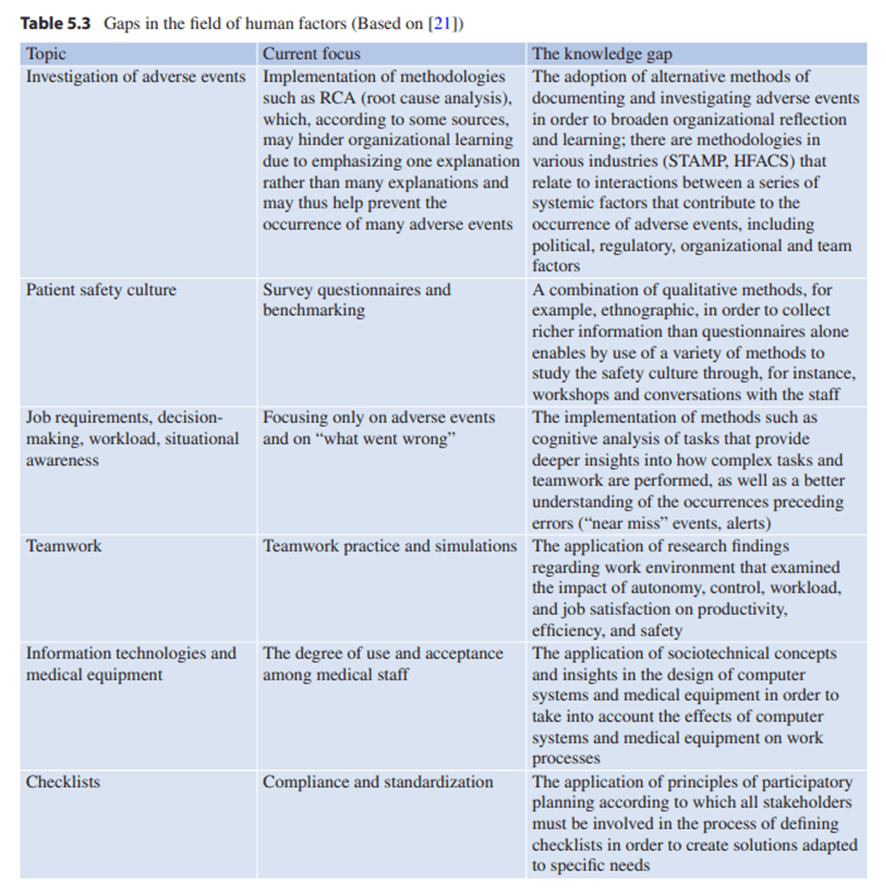 Tema Enfoque actual La brecha de conocimiento Investigación de eventos adversos Implementación de metodologías como RCA (análisis de causa raíz), que, según algunas fuentes, pueden obstaculizar el aprendizaje organizacional debido a enfatizar una explicación en lugar de muchas explicaciones y, por lo tanto, pueden ayudar a prevenir la ocurrencia de muchos eventos adversos La adopción de métodos alternativos para documentar e investigar eventos adversos para ampliar la reflexión y el aprendizaje organizacional; existen metodologías en diversas industrias (STAMP, HFACS) que se relacionan con las interacciones entre una serie de factores sistémicos que contribuyen a la ocurrencia de eventos adversos, incluidos factores políticos, regulatorios, organizacionales y de equipo Cultura de seguridad del paciente Cuestionarios de encuestas y evaluación comparativa Una combinación de métodos cualitativos, por ejemplo, etnográficos, para recopilar información más rica que los cuestionarios por sí solos permite mediante el uso de una variedad de métodos estudiar la seguridad cultura a través de, por ejemplo, talleres y conversaciones con el personal Requisitos del trabajo, toma de decisiones, carga de trabajo, conciencia situacional Centrarse solo en eventos adversos y en «lo que salió mal» La implementación de métodos como el análisis cognitivo de tareas que brindan una visión más profunda de cómo se realizan las tareas complejas y el trabajo en equipo, así como una mejor comprensión de las ocurrencias que preceden a los errores (eventos «cuasi accidentes», Prácticas y simulaciones de trabajo en equipo La aplicación de los resultados de la investigación sobre el entorno de trabajo que examinó el impacto de la autonomía, el control, la carga de trabajo y la satisfacción laboral en la productividad, la eficiencia y la seguridad Tecnologías de la información y equipos médicos El grado de uso y aceptación entre el personal médico La aplicación de conceptos y conocimientos sociotécnicos en el diseño de sistemas informáticos y equipos médicos para tener en cuenta los efectos de la informática sistemas y equipos médicos en los procesos de trabajo