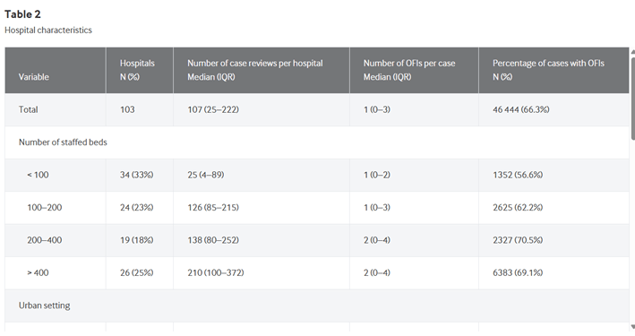Métodos Este estudio de cohorte retrospectivo multicéntrico informa datos de 103 hospitales en los EE. UU. y Canadá entre 2016 y 2023. Se realizó una regresión logística multivariable para probar las revisiones de casos en busca de diferencias en la presencia de uno o más OFI en varios tipos de hospitales (tamaño de cama, estado académico, entorno urbano, nivel de trauma y calificación general de estrellas de los Centros de Servicios de Medicare y Medicaid) y características del paciente (edad, sexo, duración de la estadía, estado del código de admisión y alta y mortalidad).