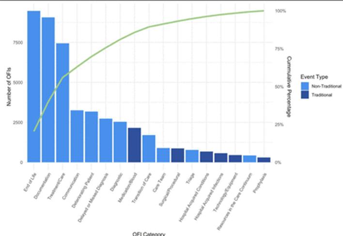 Las categorías de OFI identificadas en todas las revisiones de casos se visualizan en este diagrama de Pareto con barras para los recuentos de categorías y la línea verde para el porcentaje acumulado. Para reflejar nuestra definición ampliada de seguridad del paciente, las barras de categoría se colorearon según si se incluyeron en la definición tradicional de eventos de seguridad del paciente utilizando la herramienta de activación global IHI como referencia. 31 Los nombres de las categorías OFI aquí se han acortado para mayor claridad visual. Para obtener nombres completos, definiciones y ejemplos, consulte la tabla 1. OFI, oportunidad de mejora.