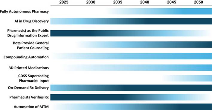 Adaptarse a estas crecientes mentalidades de consumo será un desafío, y creo que es el problema apremiante que enfrentará la práctica de la farmacia. 8 , 9 , 10 No es la tecnología por sí sola la que alterará nuestra profesión , sino la facilitación de la tecnología para satisfacer los deseos apremiantes de la sociedad. Sinceramente, dudo que podamos esperar que en las próximas décadas los pacientes quieran subirse a sus autos autónomos mientras usan su iPhone 35 esperando su receta en el drive thru de la farmacia. Si imaginamos que nuestra profesión funcionará solo de manera digitalizada o digitalizada para 2050, estaremos superados y obsoletos. Un enfoque en nuestra profesión que existe solo para suministrar y dispensar medicamentos en las próximas décadas verá una fuerza laboral altamente disminuida a medida que se sublima por el creciente auge de la automatización, la IA y las tecnologías relacionadas que permitirán una dispensación y entrega más rápidas de medicamentos a la población general mucho más allá de lo que nuestro trabajo de capital humano actual puede lograr, como se ve en la Figura 1 .