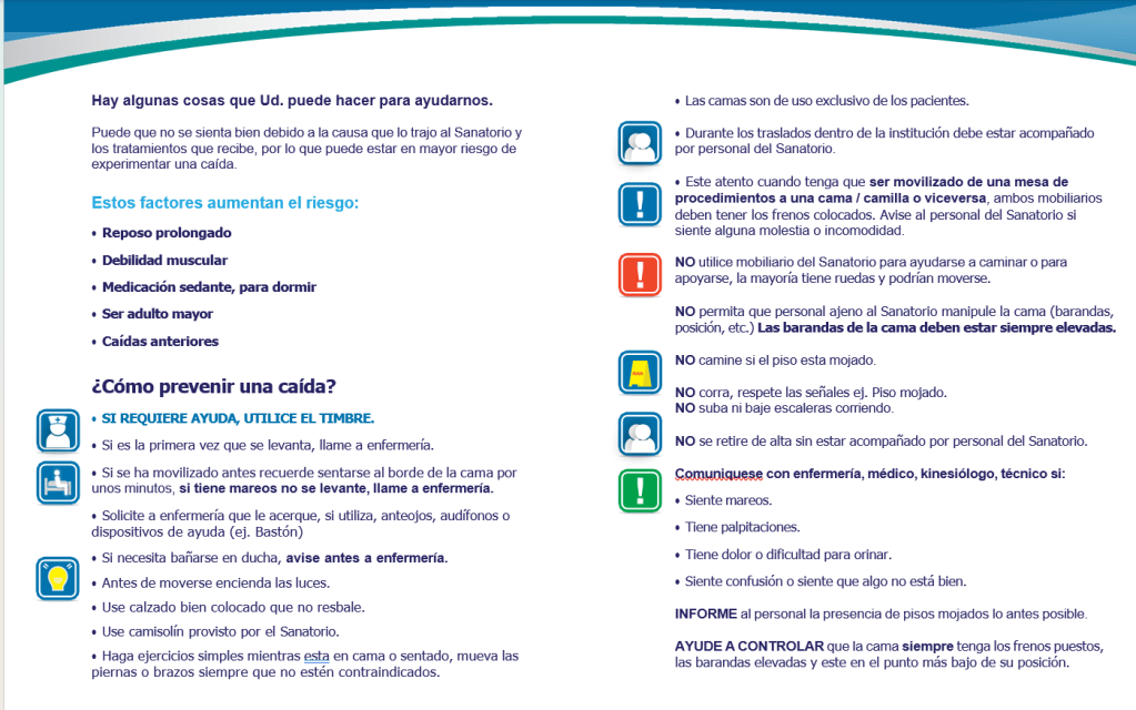 Los pacientes cuando se internan en el hospital tienen riesgos de eventos adversos, uno de ellos es las caídas, su prevención, la evaluación de los riesgos, las medidas de prevención son fundamentales. La seguridad del paciente se ha convertido en una prioridad absoluta para las organizaciones sanitarias. Un mejor entorno de seguridad del paciente se asocia con una menor probabilidad de complicaciones significativas. La calidad, el rendimiento y la productividad del sector sanitario pueden mejorarse drásticamente modificando el entorno de seguridad del paciente que opera en el sector La educación al personal, debe ser un programa que involucre a los principales efectores de la atención y el cuidado tiene un impacto importante en la reducción de los eventos. Presento primero la experiencia acreditada de multi – intervención en nuestra institución Sanatorio Sagrado Corazón, cuyos lideres son el departamento de Enfermería y la residencia de gestión.