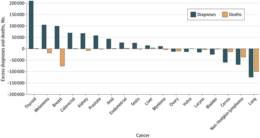 El aumento de la incidencia, combinado con una mortalidad estable, constituye una sólida evidencia de sobrediagnóstico. El cáncer de tiroides es el ejemplo clásico de un gran reservorio de cánceres subclínicos que se descubre mediante una combinación de cribado y detección incidental. 33 , 34 Sin embargo, existe una explicación alternativa: la incidencia de cáncer clínicamente significativo está aumentando, pero se ha visto compensada por las mejoras en el tratamiento, lo que mantiene estable la mortalidad. Parece improbable que estas fuerzas opuestas se alineen con tanta precisión, es decir, que los avances en el tratamiento contrarresten perfectamente el aumento de la enfermedad (ni demasiado rápido, o la mortalidad disminuiría; ni demasiado lento, o la mortalidad aumentaría).