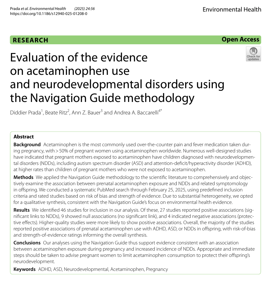 Prada, D., Ritz, B., Bauer, A.Z. et al. Evaluation of the evidence on acetaminophen use and neurodevelopmental disorders using the Navigation Guide methodology. Environ Health 24, 56 (2025). https://doi.org/10.1186/s12940-025-01208-0
