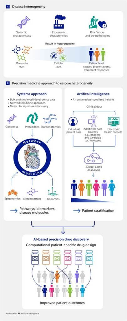 Figura 1. Medicina cardiovascular de precisión como solución a la heterogeneidad en las enfermedades cardiovasculares (ECV). (A) La heterogeneidad en las ECV surge debido a diversos factores y se manifiesta en múltiples niveles. (B) Un enfoque sistémico integral conduce a la medicina de precisión. Por un lado, la integración de datos multiómicos mediante técnicas de medicina de redes revela vías moleculares y biomarcadores de la enfermedad. Simultáneamente, un enfoque basado en inteligencia artificial (IA) utiliza datos clínicos para ofrecer resultados traslacionales, como la estratificación de pacientes y el desarrollo de fármacos y terapias de precisión. En conjunto, estos enfoques tienen el potencial de mejorar significativamente los resultados para los pacientes.