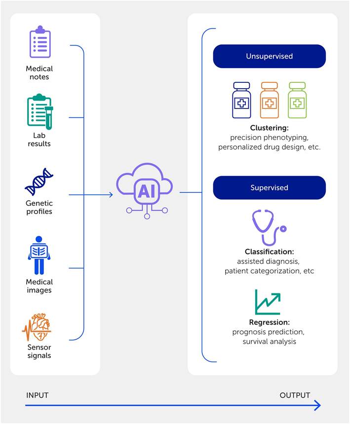 Figura 6. Un enfoque de medicina de precisión basado en inteligencia artificial (IA). Un análisis exhaustivo del flujo de trabajo de la IA en medicina, que destaca las diversas entradas de datos y distingue entre aplicaciones de aprendizaje supervisado y no supervisado en entornos clínicos y de investigación.