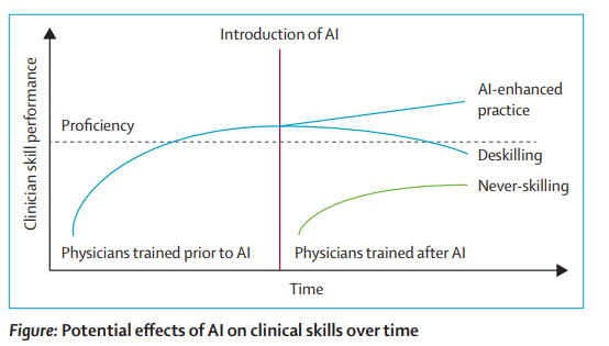 A medida que la inteligencia artificial (IA) asume un papel cada vez mayor en la práctica clínica, crece la preocupación de que la descarga de tareas clínicas y razonamientos conduzca a la pérdida de habilidades (deshabilidad), a la adopción de errores o sesgos de la IA (matar), o a la falta de competencia (nunca habilidad; cifra). Se ha observado evidencia de esta pérdida de habilidades mediante la interpretación automatizada de electrocardiogramas o imágenes radiológicas. Sin embargo, un estudio observacional publicado a principios de este año acentua esta preocupación, sugiriendo que colonoscopistas experimentados perdieron cierta eficacia en la detección de pólipos de colon cuando se desactivó el soporte rutinario de IA.