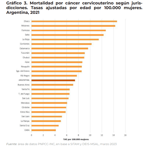 Como se observa en el Gráfico, la mayor mortalidad se registró en Chaco (14,5/100.000 mujeres), seguida de la provincia de