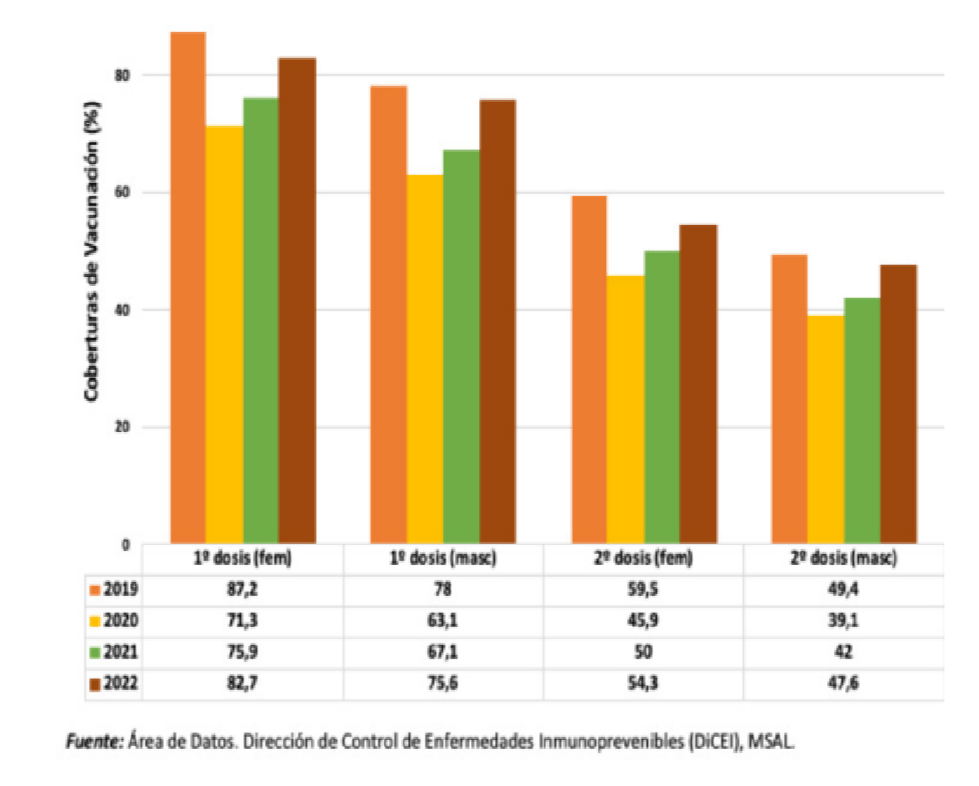 En Argentina se observa una caída en la tasa de inmunizaciones de primer y segunda dosis en mujeres y hombres respectivamente de los valores observados antes de la pandemia.