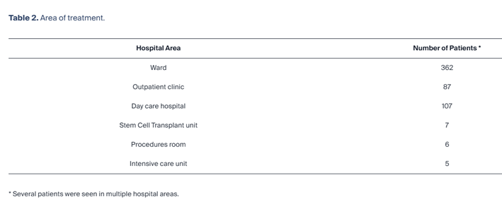 Los participantes fueron visitados principalmente en la sala (362), seguidos del hospital de día (107), una unidad especializada dentro del hospital donde los pacientes reciben atención para procedimientos o tratamientos que no requieren hospitalización, la clínica ambulatoria (87), la unidad de trasplante de células madre (7), el área de procedimientos (6) y la unidad de cuidados intensivos (5) ( Tabla 2 ). Algunos pacientes fueron visitados en varias áreas del centro según su estado clínico y necesidades.