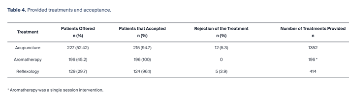 La acupuntura fue recomendada a 227 pacientes, con una tasa de aceptación del 94,7%. La aromaterapia fue ofrecida a 114 pacientes, logrando una aceptación del 100%. La reflexología se indicó en 134 casos, con una aceptación del 96,1%. Las principales razones de consulta para estas terapias fueron náuseas y vómitos inducidos por quimioterapia, trastornos gastrointestinales, dolor, estrés y ansiedad. Las intervenciones se realizaron en diversos ámbitos hospitalarios, incluyendo salas de hospitalización, hospital de día y consultas externas.