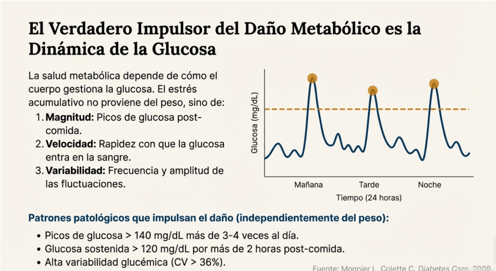 La salud metabólica depende fundamentalmente del manejo de la glucosa. Tres factores determinan el estrés metabólico asociado a la glucosa: la magnitud, la velocidad y la variabilidad de los picos de glucosa. Estudios de monitoreo continuo han demostrado que la variabilidad glucémica predice complicaciones metabólicas con independencia del peso corporal.