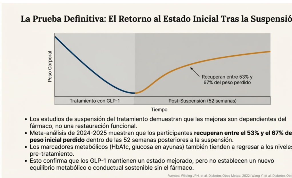 Dado que el peso regresa al interrumpir el tratamiento, se evidencia que los GLP-1 mantienen un estado mejorado sin establecer un nuevo equilibrio metabólico. A largo plazo, esto implica que el tratamiento es más bien un manejo crónico de la enfermedad que una cura.