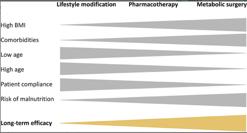 Los pacientes con formas avanzadas de obesidad suelen tener respuestas subóptimas solo a intervenciones de estilo de vida, médicas o quirúrgicas; por lo tanto, puede ser necesario un tratamiento combinado.