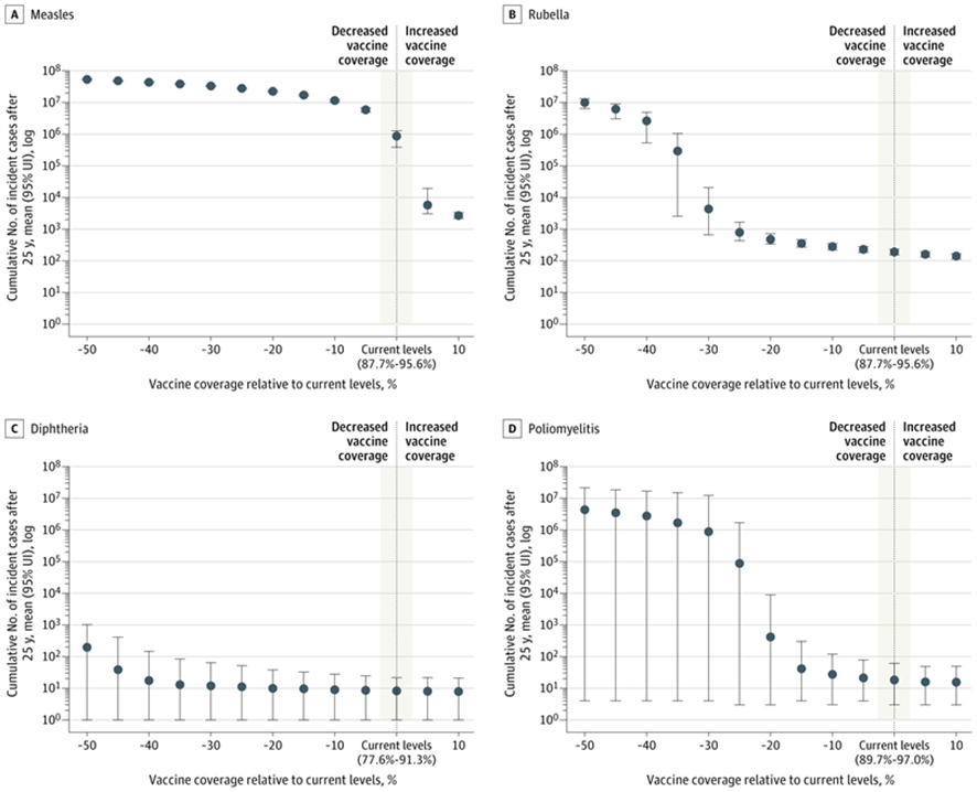 Si la vacunación infantil sistemática disminuyera en un 25%, estimamos que se producirían 26,9 millones (95% UI, 25,5 millones-28,1 millones) de casos de sarampión en el período de 25 años, 790 casos (95% UI, 429-1700 casos) de rubéola, 87 600 casos (95% UI, 3 casos a 1,7 millones de casos) de poliomielitis y 11 casos (95% UI, 1-52 casos) de difteria. En este escenario, proyectamos que habría 26 900 casos (95% UI, 25 500-28 100 casos) de secuelas neurológicas post sarampión, 100 casos (95% UI, 0-1300 casos) de poliomielitis paralítica, 1 caso (95% UI, 0-3 casos) de síndrome de rubéola congénita, 5,4 millones de hospitalizaciones (95% UI, 5,1-5,6 millones de hospitalizaciones) debido a todas las infecciones y 80 600 muertes (95% UI, 76 500-84 300 muertes) debido a todas las infecciones.
