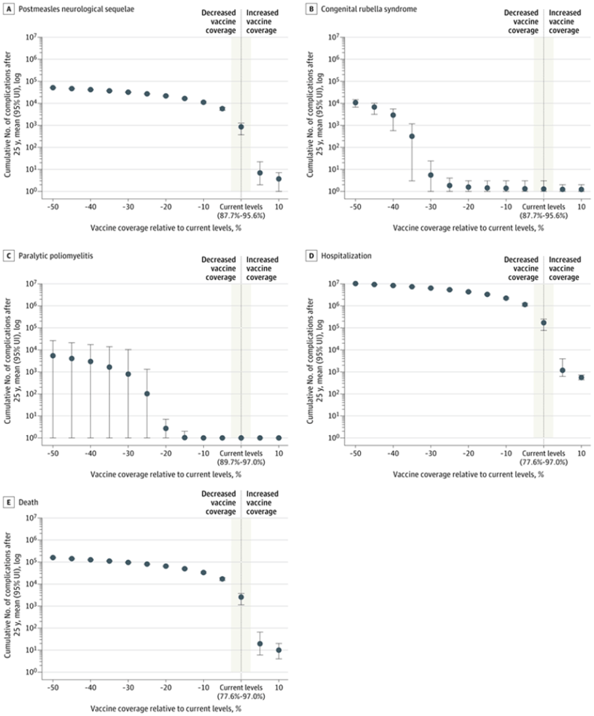 Si la vacunación infantil de rutina disminuyera en un 50%, el modelo de simulación predijo que habría 51,2 millones de casos (95% UI, 49,7-52,5 millones de casos) de sarampión durante un período de 25 años, 9,9 millones de casos (95% UI, 6,4-13,0 millones de casos) de rubéola, 4,3 millones de casos (95% UI, 4 casos a 21,5 millones de casos) de poliomielitis y 197 casos (95% UI, 1-1000 casos) de difteria. En este escenario, proyectamos que habría 51 200 casos (95% IU, 49 600-52 600 casos) de secuelas neurológicas postsarampión, 5400 casos (95% IU, 0-26 500 casos) de poliomielitis paralítica, 10 700 casos (95% IU, 6700-14 600 casos) de síndrome de rubéola congénita, 10,3 millones de hospitalizaciones (95% IU, 9,9-10,5 millones de hospitalizaciones) debido a todas las infecciones y 159 200 muertes (95% IU, 151 200-164 700 muertes) debido a todas las infecciones ( Figura 1 , Figura 2 y Tablas electrónicas 8-9 en el Suplemento 1 ).